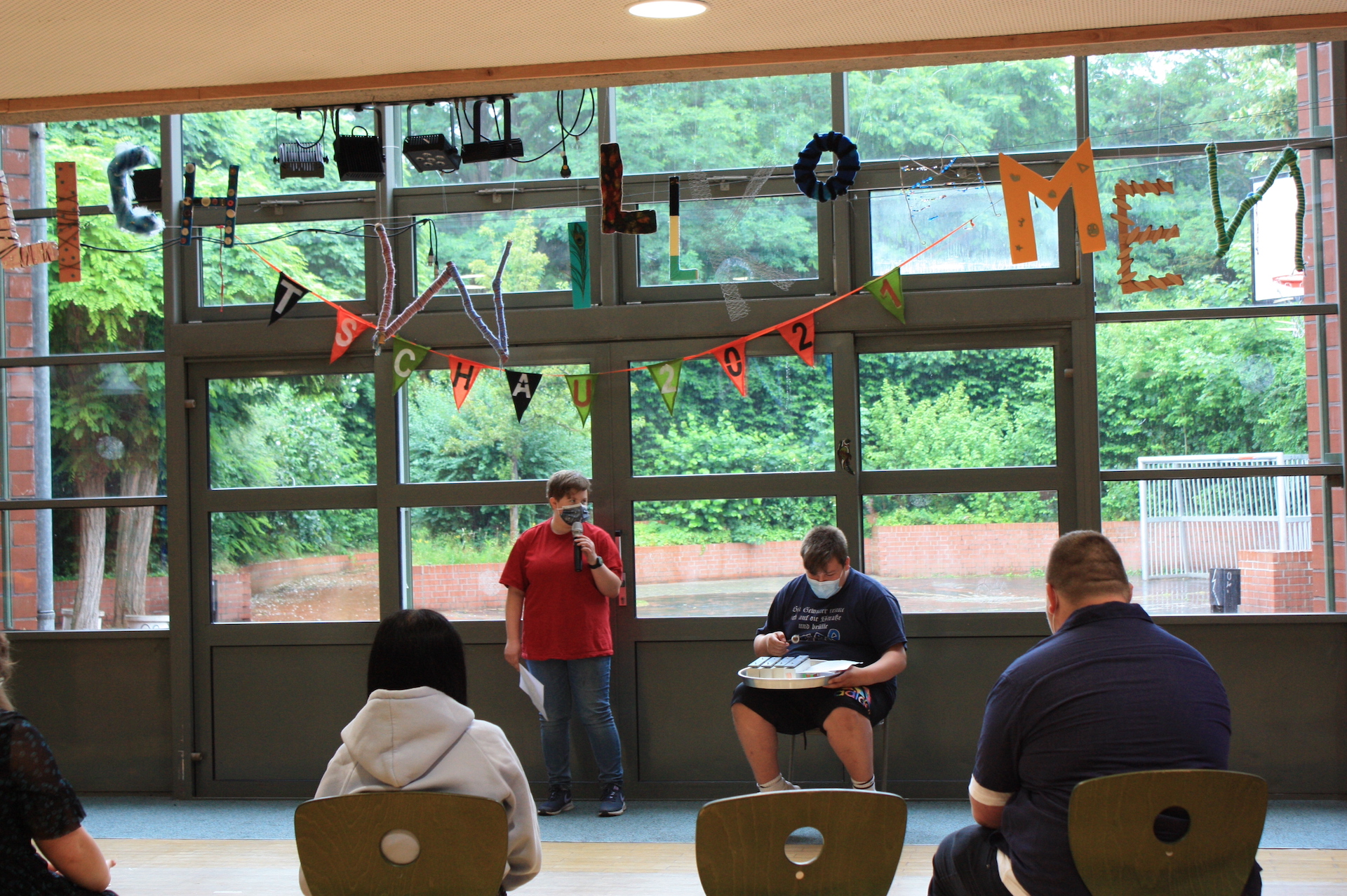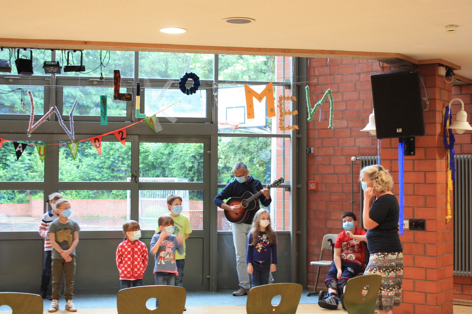Trotz noch immer geltender Covid-19-Auflagen haben viele Klassen einen witzigen Beitrag zu dem Abschlussprogramm beigetragen: Die Eingangsstufe wünschte den Entlassschülern Glück, Klasse 9 wartete mit einem selbstgestalteten Gedicht auf und die Klasse 7b hatte ein Klatschspiel zum Nachmachen vorbereitet. Zum Abschluss erinnerte uns Klasse 7a daran, dass dies „my life“ ist.
