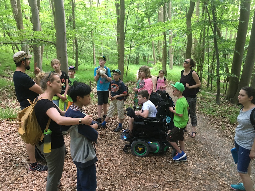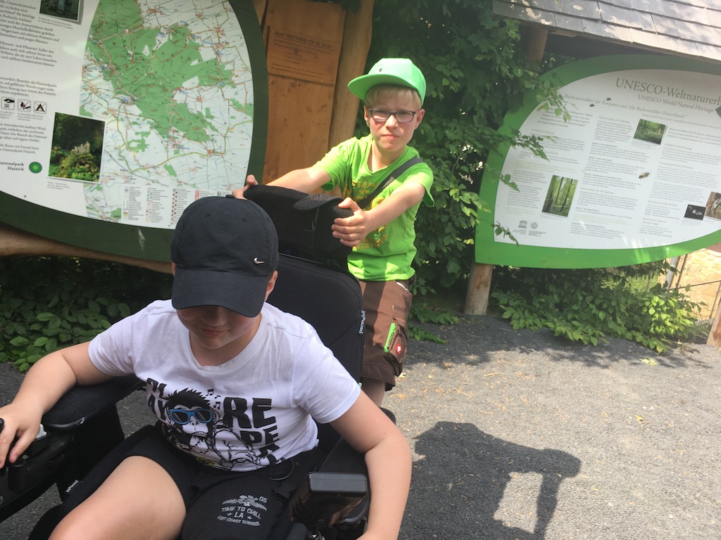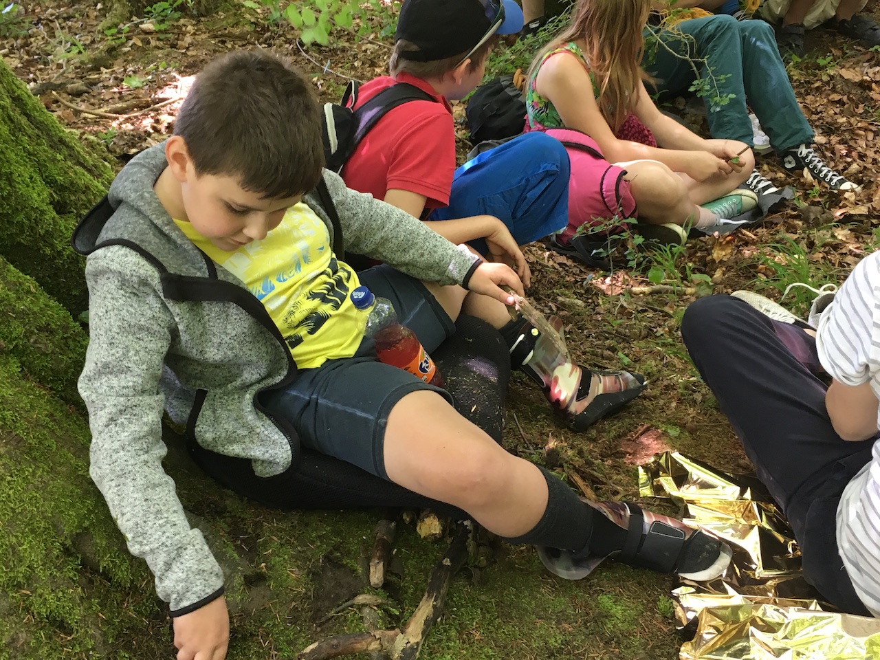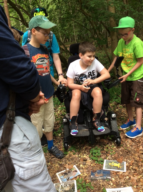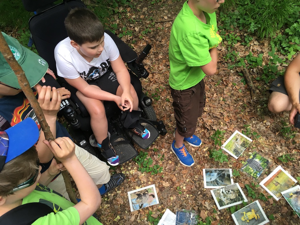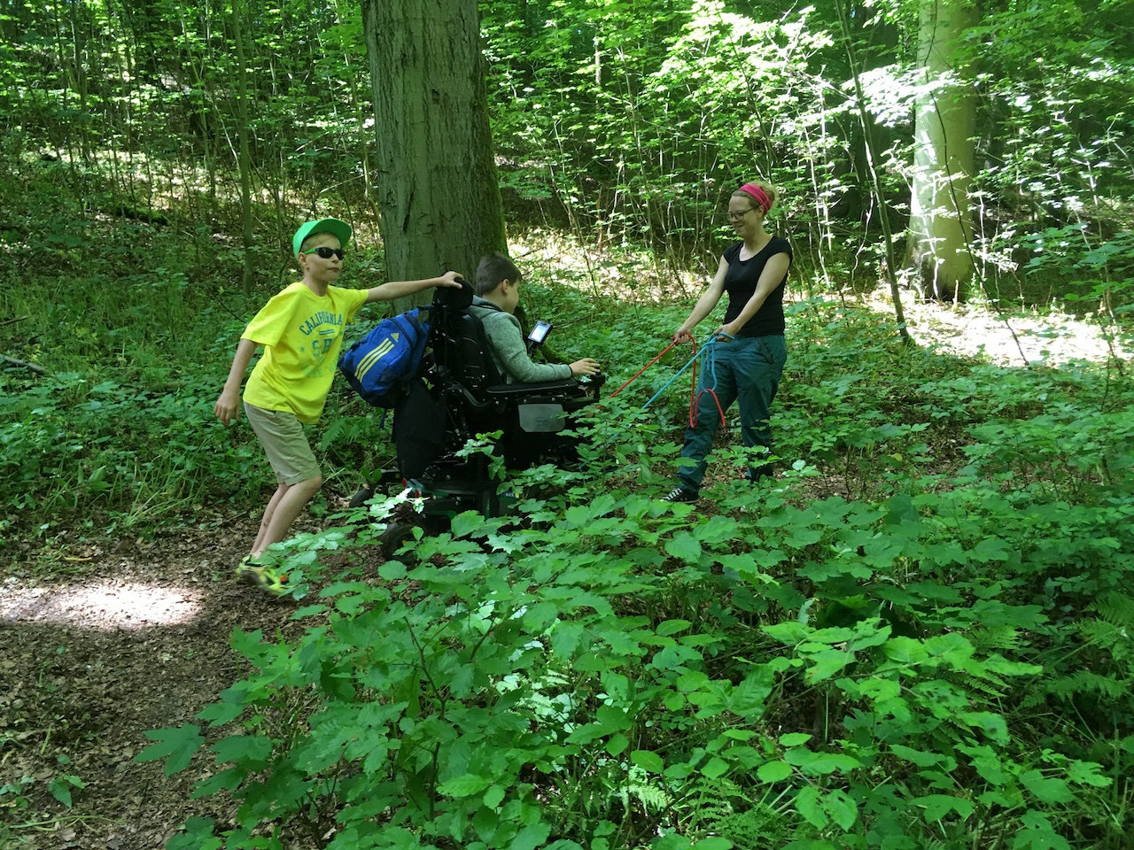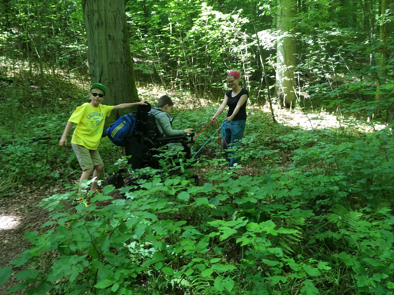 Donnerstag war unser Waldtag. Nach dem Frühstück haben wir eine  Schnitzeljagd gemacht. Gruppe 1 mit  Nick , Stavros, Aric, Fiona, Oskar, Meffi und Herr Beckermann  haben eine Spur gelegt und versteckten sich unter einem umgefallenen Baum. Im Wald haben Till, Herr Beckermann und Oskar viel Spas gehabt. Im Wald haben wir alle Mittag gegessen. Meffi war auch müde von der Schitzeljagd und musste sich ausruhen. Oskars E-Rolli  hat sich Im Matsch fest gefahren. Leonies Socken sind dreckig. Aric,Oskar, und Frau Meister ziehen den  E-Rolli aus dem Wald.