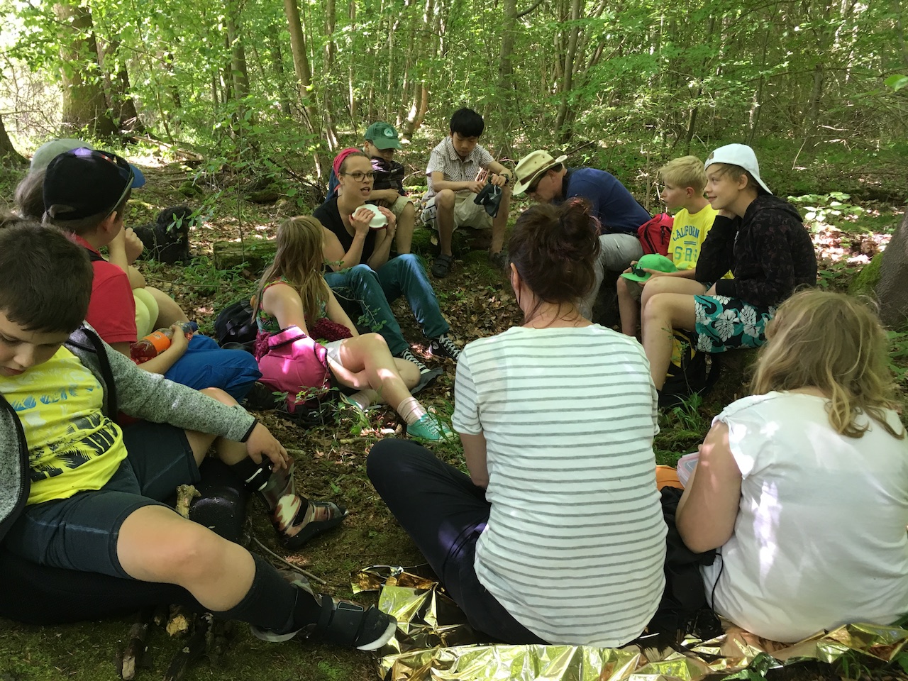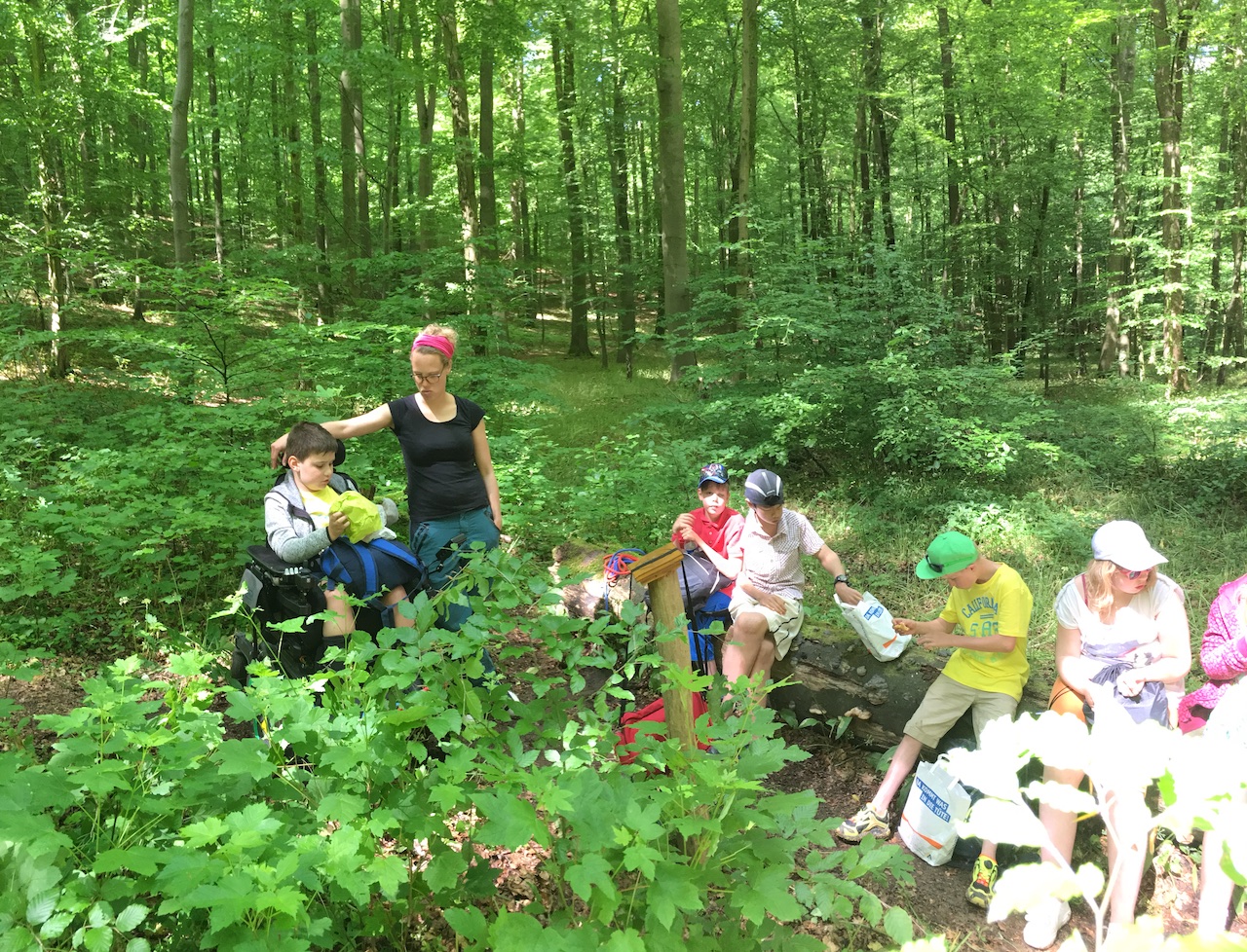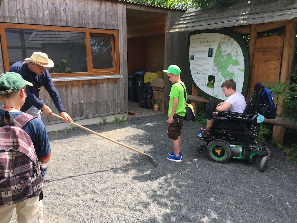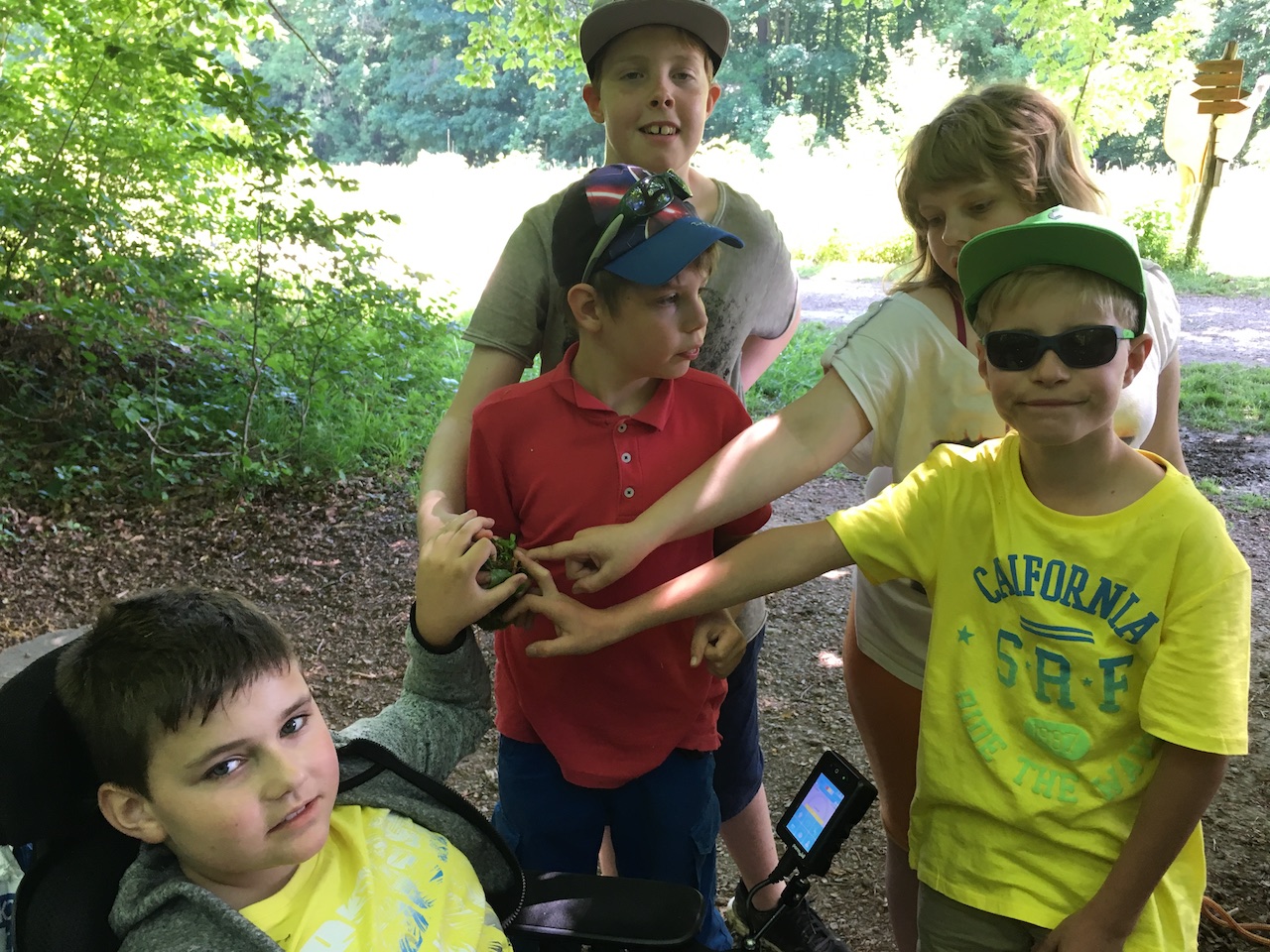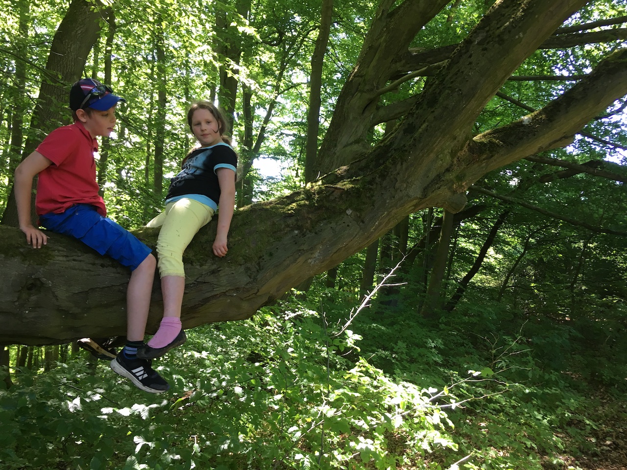 Donnerstag war unser Waldtag. Nach dem Frühstück haben wir eine  Schnitzeljagd gemacht. Gruppe 1 mit  Nick , Stavros, Aric, Fiona, Oskar, Meffi und Herr Beckermann  haben eine Spur gelegt und versteckten sich unter einem umgefallenen Baum. Im Wald haben Till, Herr Beckermann und Oskar viel Spas gehabt. Im Wald haben wir alle Mittag gegessen. Meffi war auch müde von der Schitzeljagd und musste sich ausruhen. Oskars E-Rolli  hat sich Im Matsch fest gefahren. Leonies Socken sind dreckig. Aric,Oskar, und Frau Meister ziehen den  E-Rolli aus dem Wald.