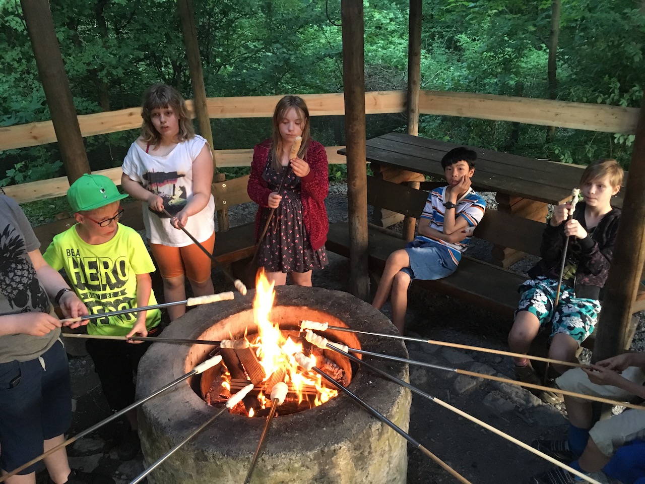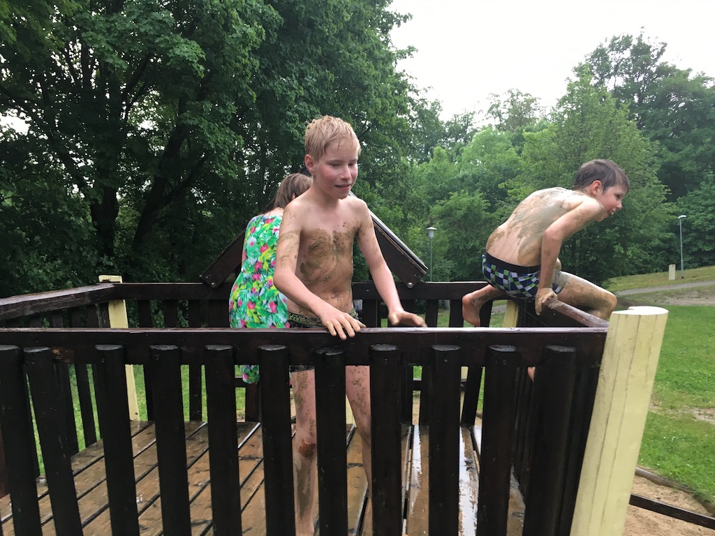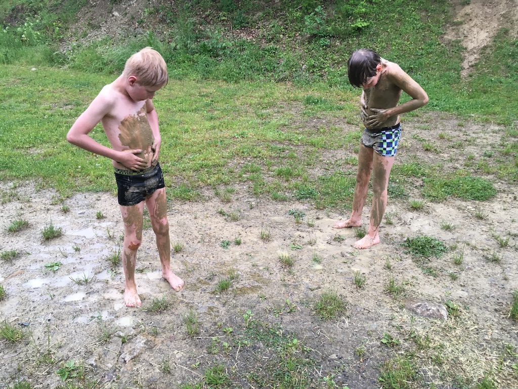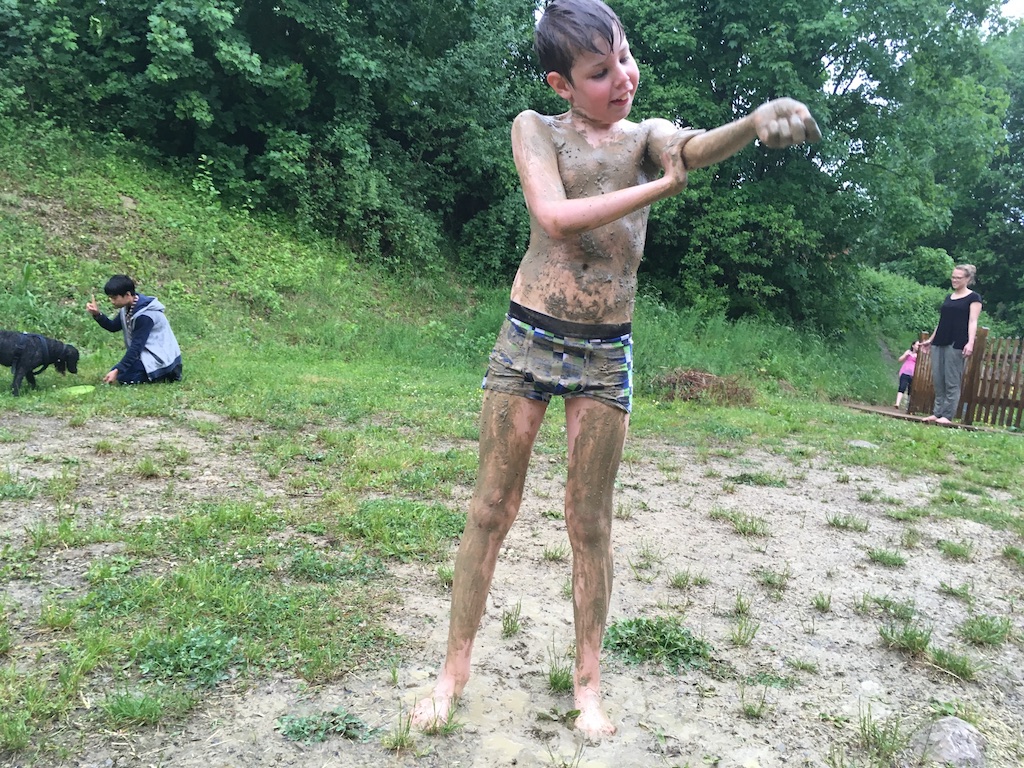 Morgens sind wir von Musik aufgewacht. Naja nicht alle...Wir haben uns angezogen. Dann sind wir zum Frühstück gegangen und haben uns Lunchpakete gemacht. Das war gar nicht so einfach weil da hunderte andere Kinder waren. Wir sind in der Disko. Wir waren draussen im Wald. Meffie hat gegessen. Wir machen einen Regentanz und sind durch den Regen gelaufen. Aric und Adrian spielen im Matsch. Wir machen alle Bogenschiessen. Oskar hat mit Frau Naumann Frühstück gegessen. Adrian guckt in die Kamera. Lilly guckt auch in die Kamera. Wir sind im Katzenpark. Es war toll. Dienstag war toll.