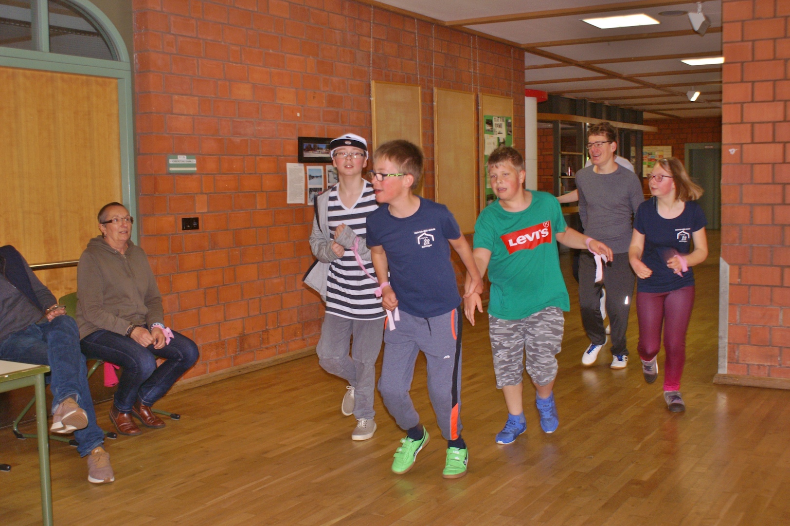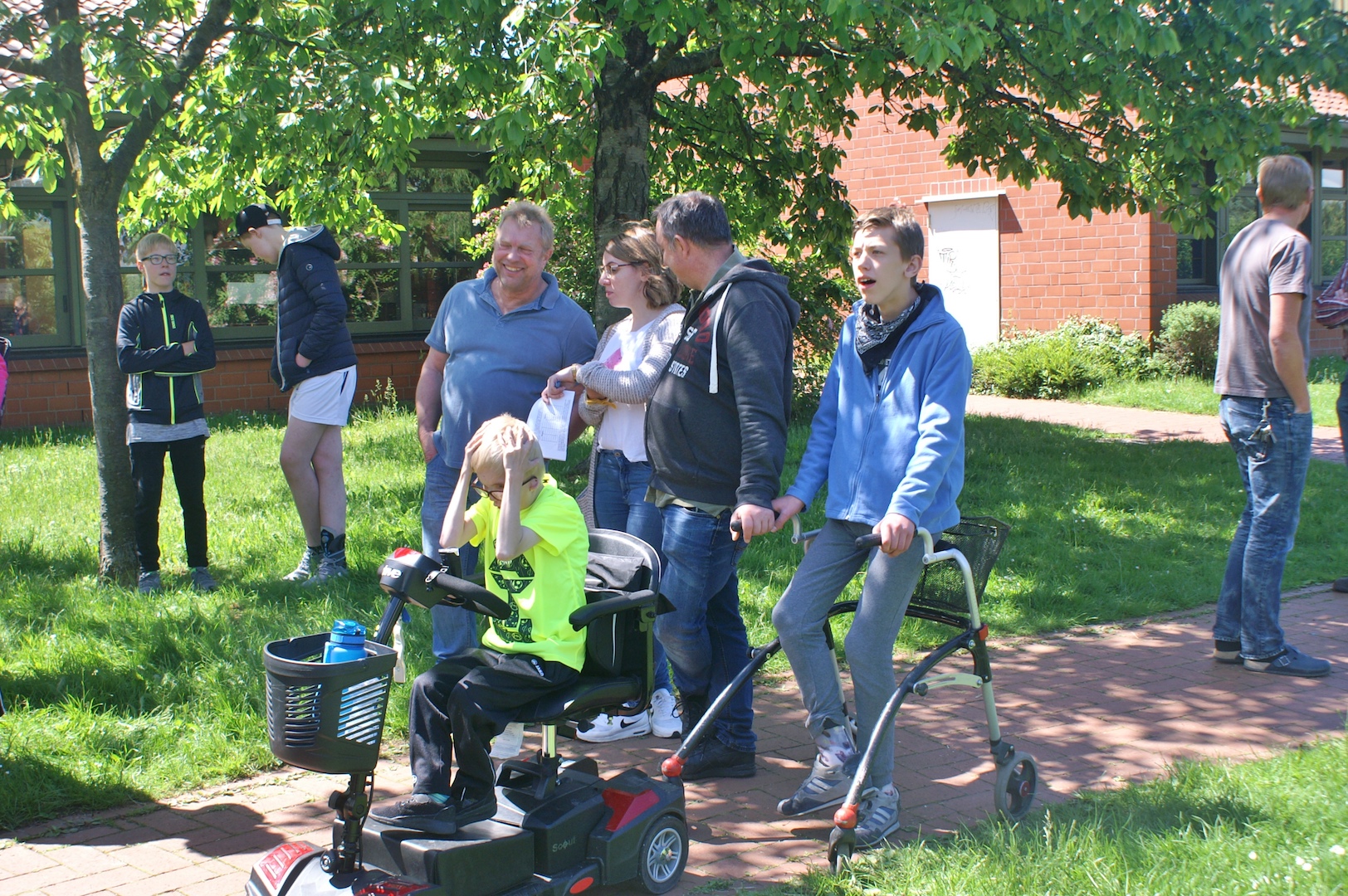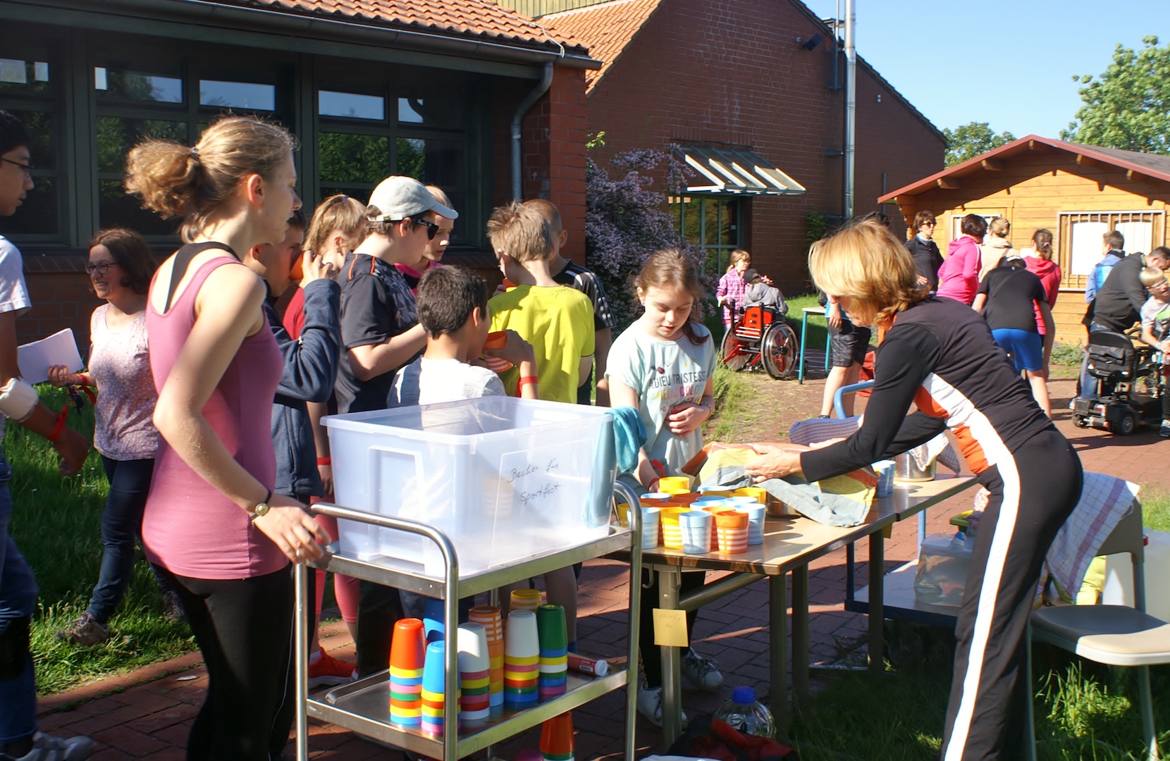 An den Stationen ‚Kegeln‘, ‚Sandsack ziehen‘,‘ Zielwerfen‘,‘ Rollstuhlparcours‘, ‚Tisch ziehen‘, ‚Lauf über Distanzen‘ und ‚Treppensteigen‘ zeigten alle eine hohe Anstrengungsbereitschaft und die Fähigkeit zur Teamarbeit.