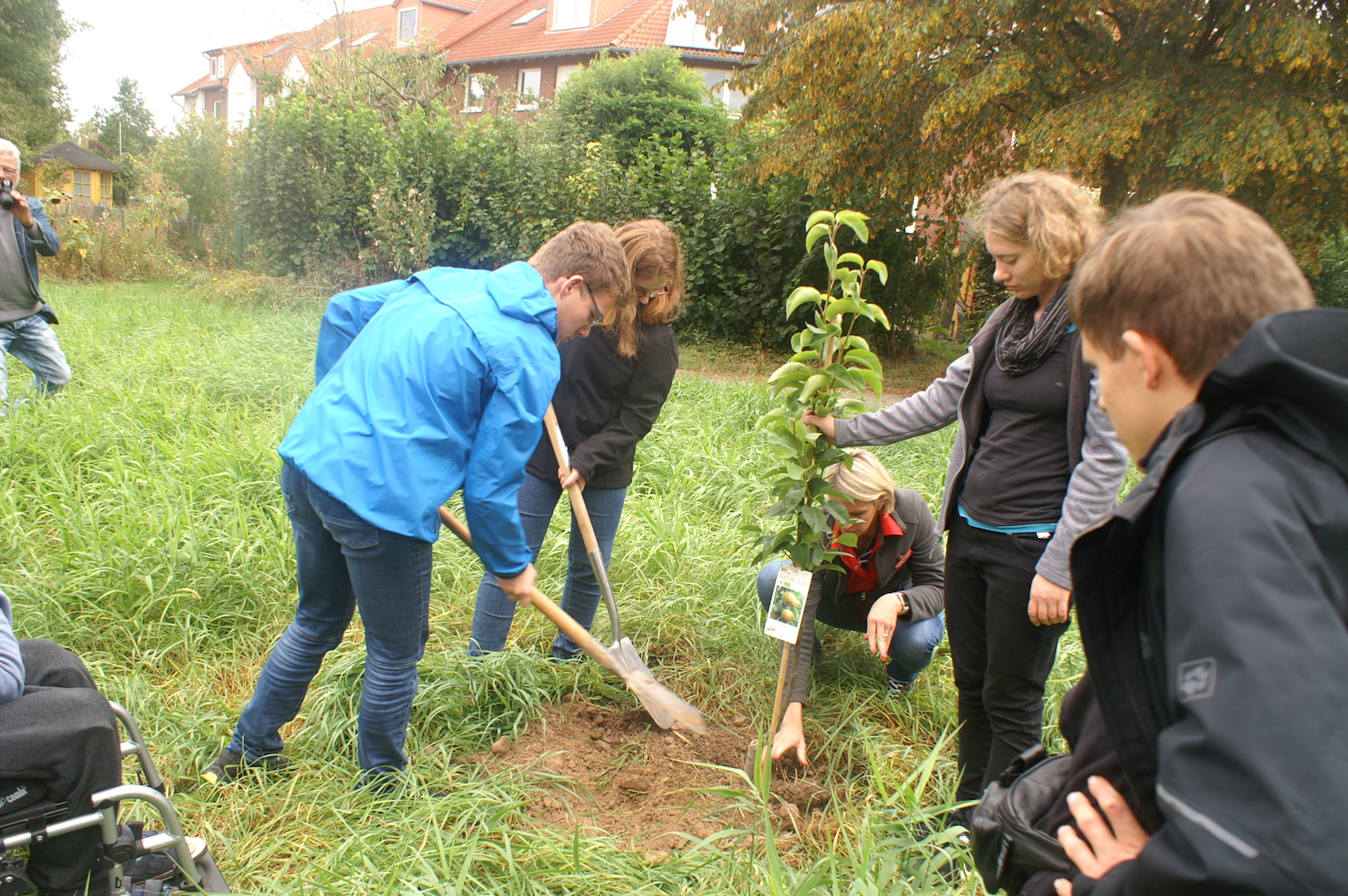 Für einen Apfel-, Birnen- und Pflaumenbaume buddelten sie im Grüngürtel ‚Am Rischen‘ zunächst tiefe Löcher und setzten die Bäume vorsichtig ein. Anschließend erfolgte die feierliche Übergabe der Patenurkunde durch den stellvertretenden Ortsbürgermeister, Herrn Thomas Harms. Die Schülerinnen und Schüler wurden für ihr Engagement für Göttingens Begrünung gelobt und ihnen die Pflicht für die Sorge um das Wohlergehen der Bäume verdeutlicht. Ihr Lohn sei die Freude am Wachstum und die Ernte der Früchte.