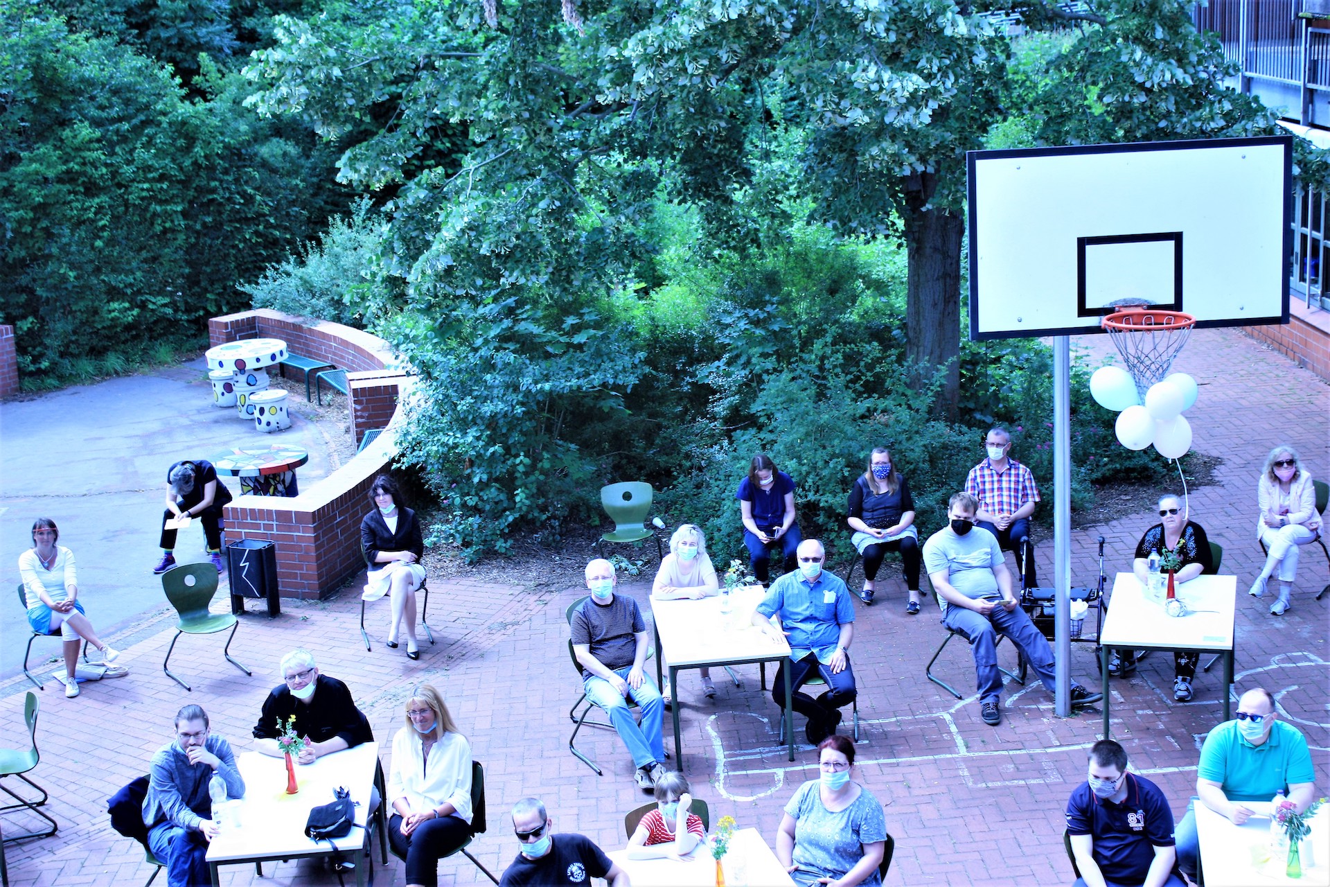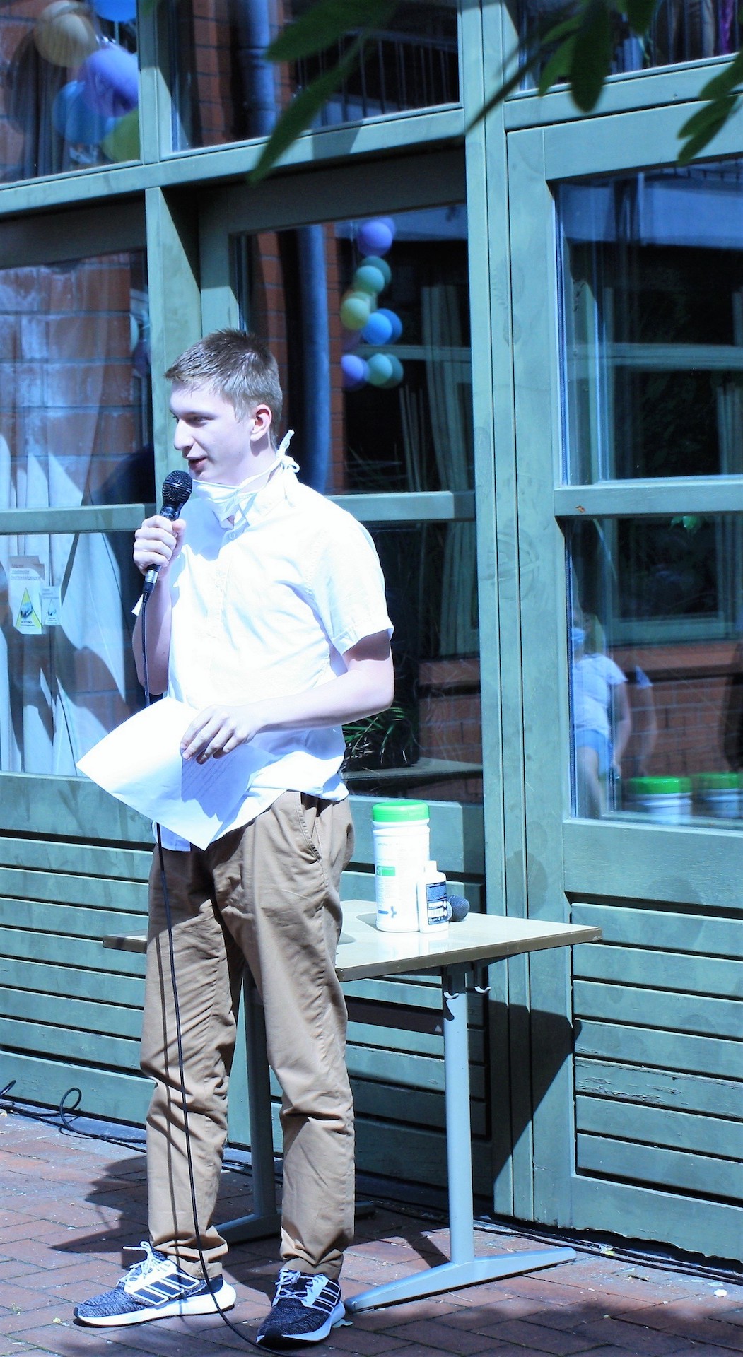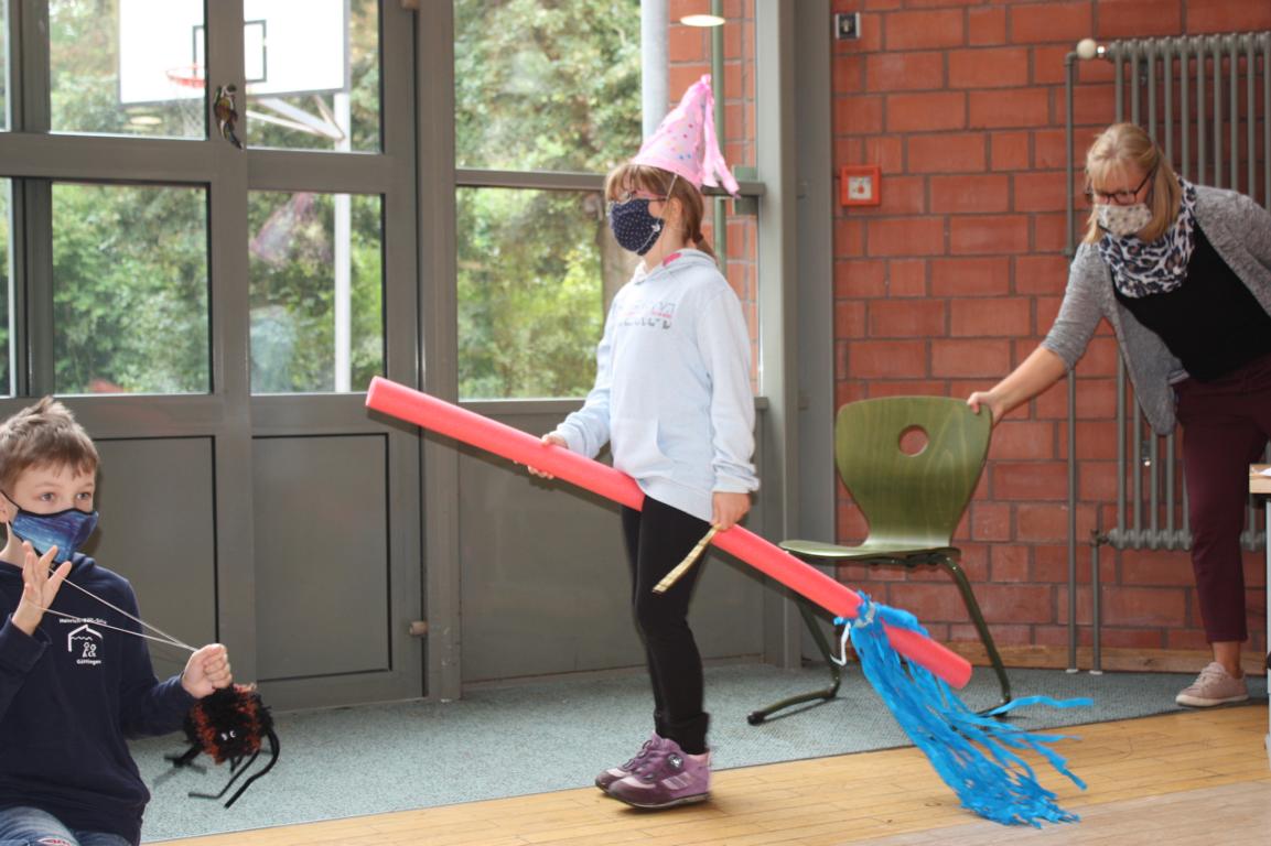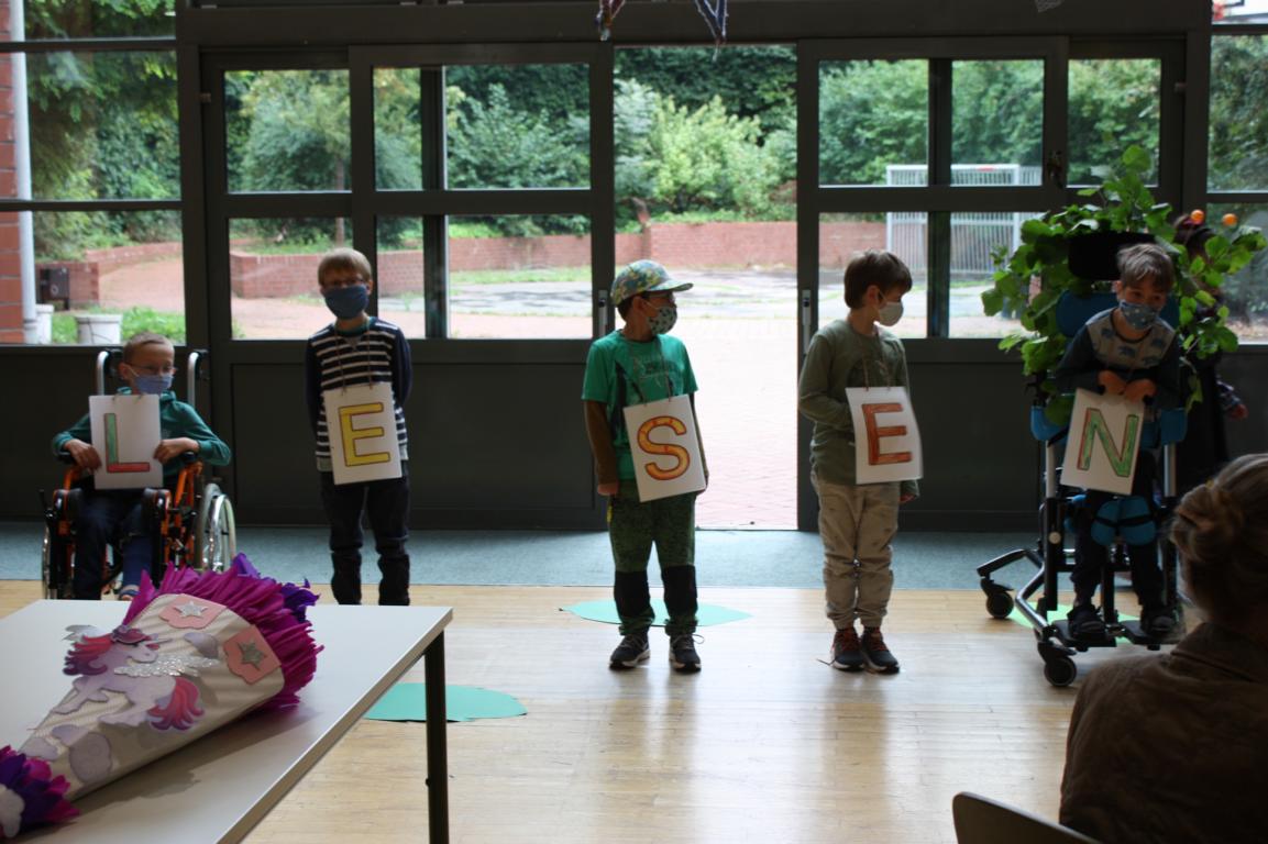Es war das erste (und hoffentlich zugleich letzte) Mal, dass die neuen Kinder eingeschult wurden und nicht von der ganzen Schulgemeinschaft begrüßt werden konnten. Das Empfangskomitee bestand aus den drei Klassen der Eingangsstufe und der Klasse 5. Es hatte sehr kreative Ideen: Die Klasse 5 bot blumige Grüße auf der Leinwand an, die ESC zeigte eine Szene des Löwen in der Schule und die ESA inszenierte den „Buchstabenbaum“. „Lubo aus dem All“, der Kindern in schwierigen sozialen Situationen helfen kann, stellte sich persönlich vor, sein Lied wurde vom Unterstufenchor gestisch begleitet.